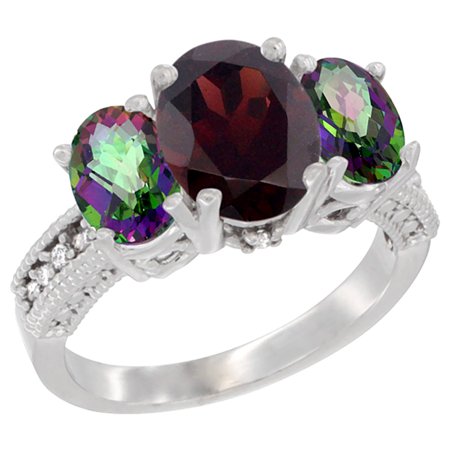 10K White Gold Diamond Natural Garnet Ring 3-Stone Oval 8x6mm with Mystic Topaz, sizes5-10