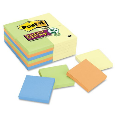 The note pads utilize self-stick, removable adhesive, making them great for notes, lists, messages, indexing, tabbing, color-coding and much more. Revolutionary adhesive technology allows notes to stick securely to more surfacesÑpractically anywhere! Stick your notes where they'll really get noticed.. like monitors, doors and walls! Includes 12 pads of Canary Yellow and 12 pads of Assorted Electric Glow Colors. Made with plant-based adhesive. Sheet Size (W x H): 3" x 3".