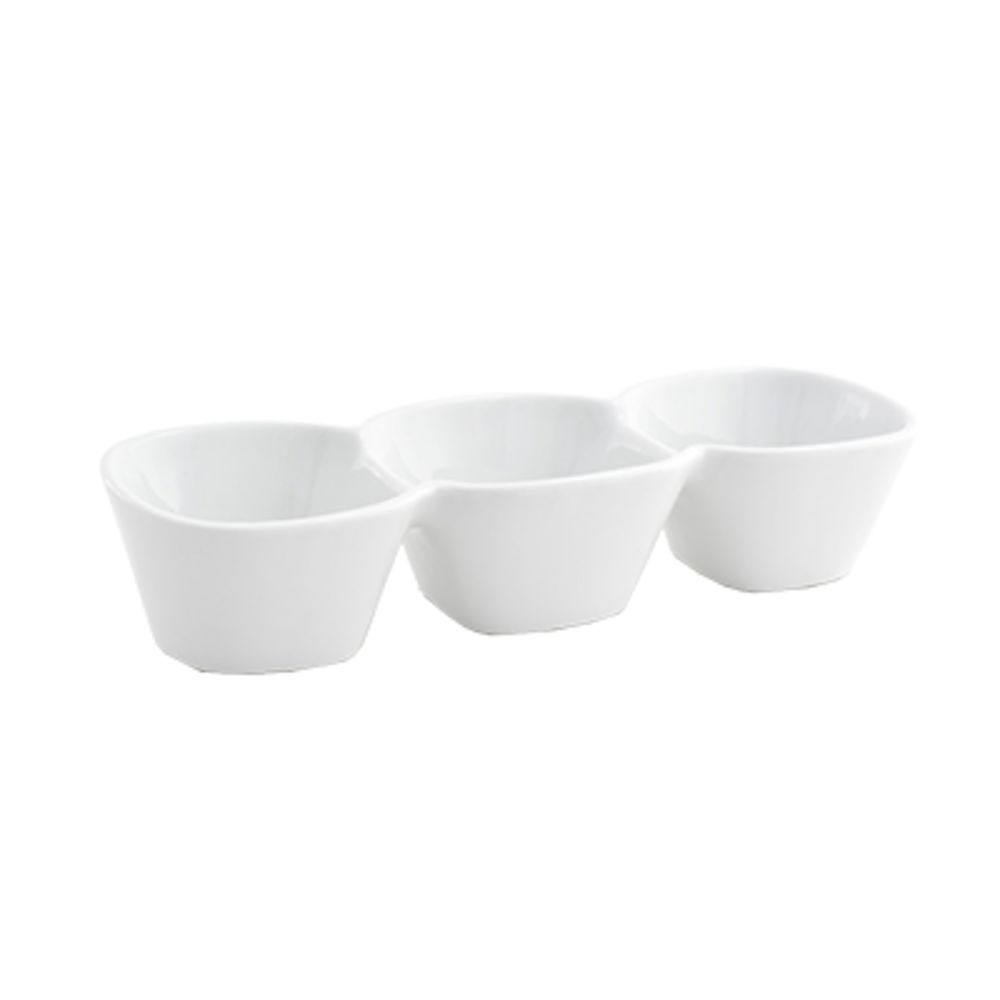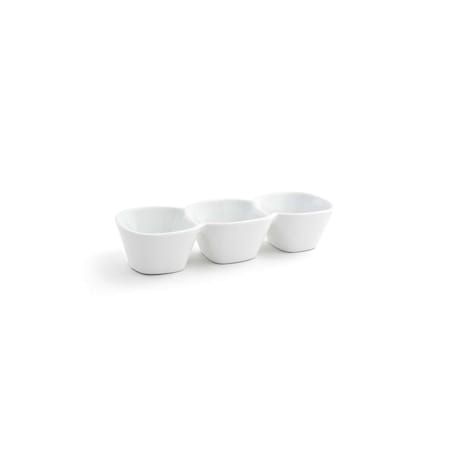 Front Of The House Mod White Porcelain 3-Compartment Bowl This bowl will allow you to offer several different sauces at one time. Each section will hold 4 ounces of sauce.Model #: BBO008WHP22 Collection: Mod Material: Porcelain Color: White Capacity: 4 oz each section Dishwasher, microwave, and oven safe Stackable Height: 3" Width: 5" Length: 9" Shipping weight: 6 lbs 128390
