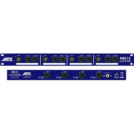 The <strong>ARX MSX 12</strong> Transformer isolated Microphone/Line Splitter has been developed to deliver noise-free audio splitting with minimal setup time. Its intuitive layout and clear, uncluttered labelling enables a quick and easy solution to the increasing complexity of today's standards of audio production.</p><p>The MSX 12 is a totally passive device requiring no power, and consists of Four channels of transformer isolated ultra low noise Microphone/Line Splitter. Each of these channels has a direct looped Main/FOH feed, and a transformer isolated Monitor split on the front panel. <br /> <br />On the rear panel is an Auxiliary transformer isolated split ideal for use with a remote recording truck or TV feed.</p><p>Marker panels on the front provide a space where individual channel connections can be noted.</p><p>The all-steel chassis of the MSX 12 provides strong interference resistant shielding. Internally, state-of-the-art transformers deliver superb audio quality and total galvanic isolation.</p><p>The MSX 12 is the easy answer to multi channel signal splitting requirements.<br /> </p>