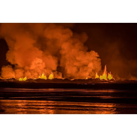 Panoramic Images Stretched Canvas Art - Volcano Eruption at the Holuhraun Fissure, Bardarbunga Volcano, Iceland. - Large 27 x 9 inch Wall Art Decor Size.