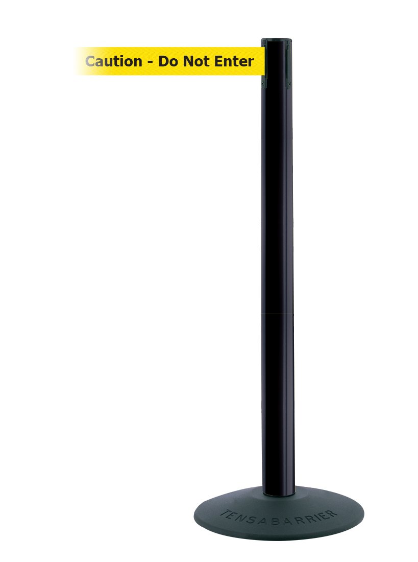 Barrier Post with Belt, Post Material PVC, Post Finish Black, Post Height 38 in, Post Dia. 2 1/2 in, Base Type Basic, Base Dia. 14 in, Base Material Steel, Base Finish Black ABS No Scuff Cover, Number of Belts 1, Belt Length 7 1/2 ft, Belt Color Yellow with Black Text, Belt Message Caution - Do Not Enter, Belt Width 2 in, Indoor, ADA Compliance Yes