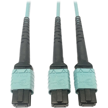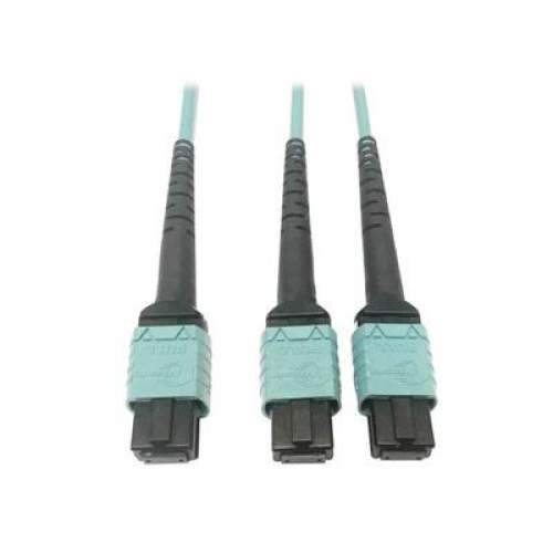 Tripp Lite N846D-03M-24BAQ 400G Multimode 50/125 OM4 Plenum Fiber Optic Cable, 24F MTP/MPO-PC to (x2) 12F MTP/MPO-PC (F/F), Aqua, 3 m | JensenTools