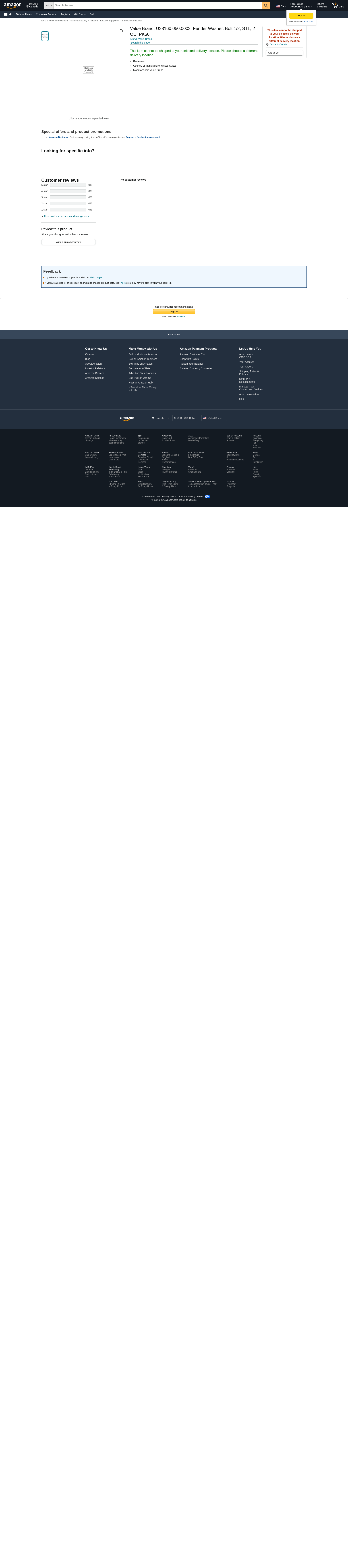Value Brand, U38160.050.0003, Fender Washer, Bolt 1/2, STL, 2 OD, PK50
