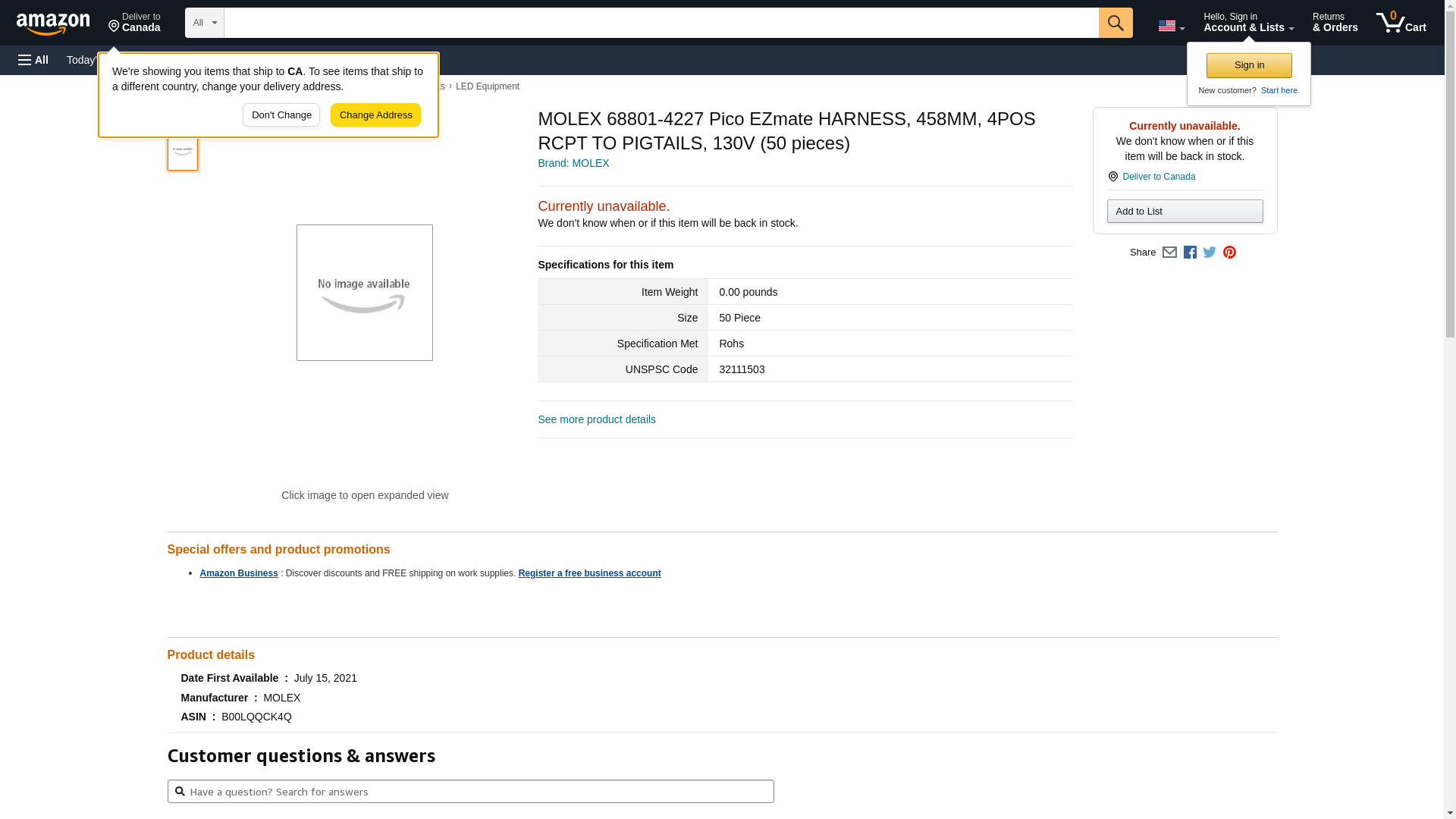 MOLEX 68801-4227 Pico EZmate HARNESS, 458MM, 4POS RCPT TO PIGTAILS, 130V (50 pieces)