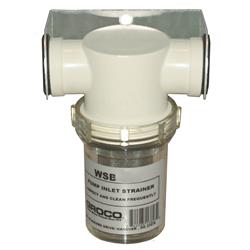 Protect fresh water pumps from debris. White nylon strainer head and clear plastic sight glass. Glass unscrews for filter basket cleaning. Mounting bracket included.