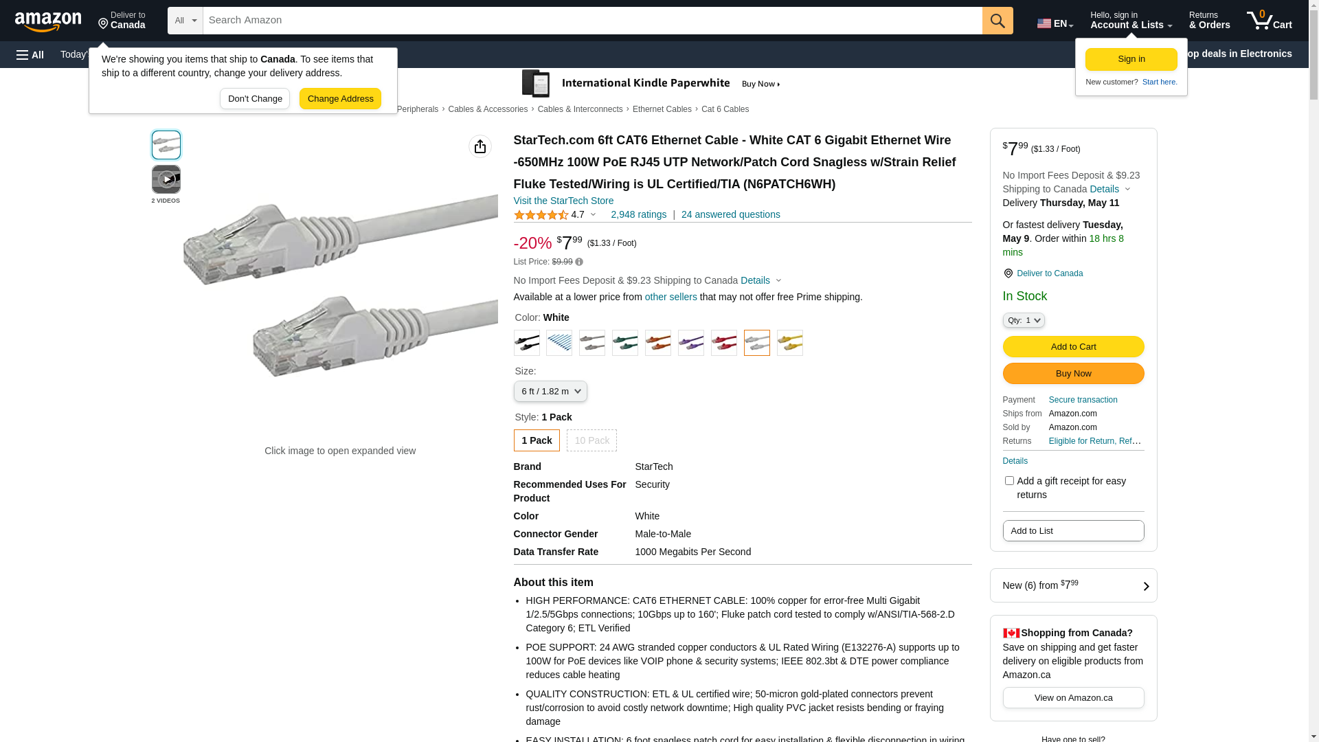 Buy Startech N6PATCH6WH As low as $8.64 in bulk In stock StarTech.com 6 ft White Cat6 Cable with Snagless RJ45 Connectors - Cat6 Ethernet Cable - 6ft UTP Cat 6