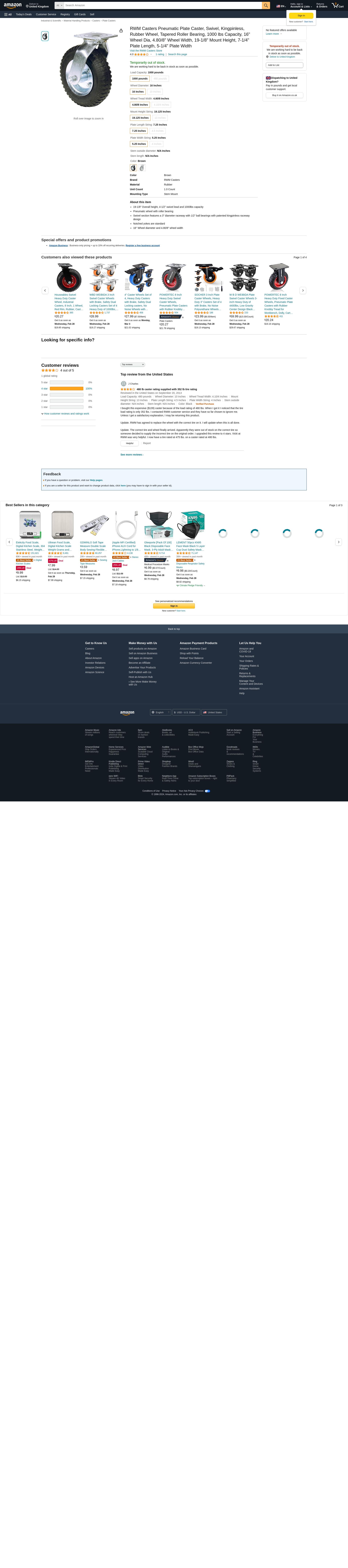 RWM Casters Pneumatic Plate Caster, Swivel, Kingpinless, Rubber Wheel, Ball Bearing, 500 lbs Capacity, 12" Wheel Dia,...