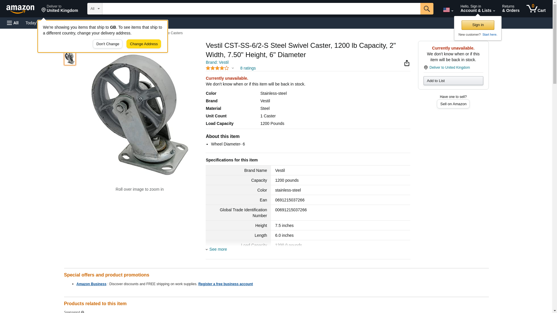 Vestil CST-SS-6/2-S Steel Swivel Caster, 1200 lb Capacity, 2" Width, 7.50" Height, 6" Diameter