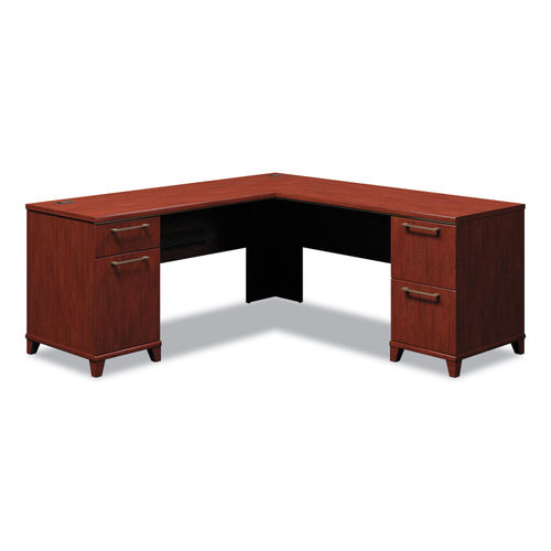 Enterprise Collection L-Desk for transitional styling that creates a professional impression anywhere. Constructed with 100% thermally fused laminate for durability and superior resistance to scratches and stains. This L-Desk provides an integrated 4-port USB hub in the desk to connect electronic devices. Our dual pedestals offer metal drawer pulls for contemporary styling and durable edge banding to resist dents. One pedestal has a top drawer, storage compartment with an adjustable shelf and self-closing Euro-style door hinges. Two additional file drawers in the second pedestal, accommodating letter, legal or A4-size files. Full-extension ball bearing drawer slides and suspension allow easy access to files. Pedestal for 72" DeskùPedestal only. Desk surface, modesty panel and additional components sold and shipped separately. Series Name: Bush« Enterprise Collection; Worksurface/Base Color: Harvest Cherry; Color Family: Cherry; Worksurface Shape: L-Shaped.