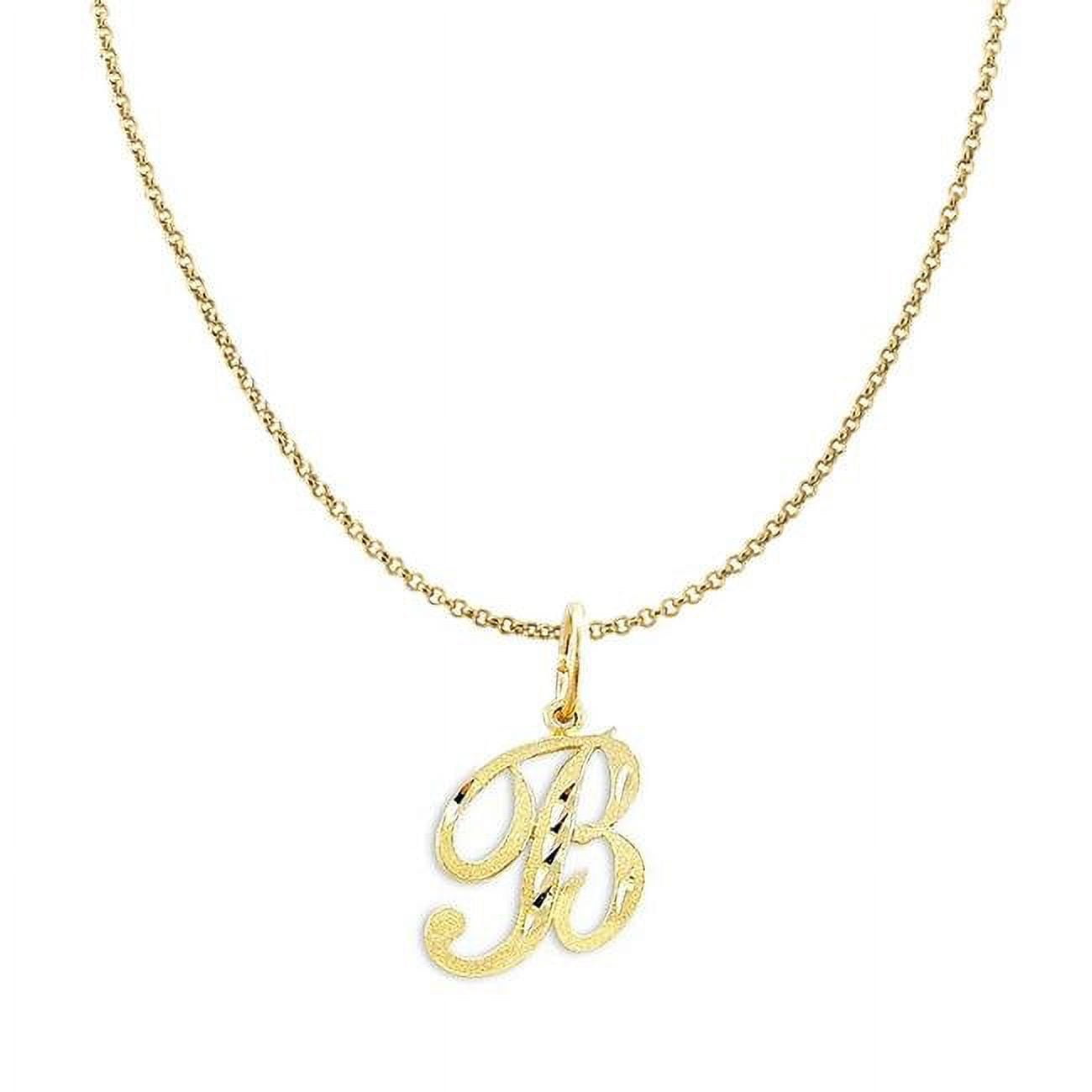 Crafted of 14-karat yellow gold, this initial letter pendant features an elegant cursive design. The "B" initial features a diamond-cut finish. The pendant measures approximately 0.50 inches in width and length and is thin and lightweight for comfortable daily wear.The pendant is completed with a matching 14k yellow gold 1.2-mm rolo cable chain with a diamond-cut design in 20 inches length.<li>Crafted of 14k Yellow gold</li> <li>Finish: Diamond-cut</li> <li>Pendant length: 15 mm (0.59 inch)</li> <li>Pendant width: 13 mm (0.51 inch)</li> <li>Initial letter B</li> <li>Gold weight is approximate: 0.51</li><strong>Chain details:</strong> </li> <li>Crafted of 14k yellow gold</li> <li>Chain Style: Rolo Cable chain with angled diamond-cut design</li> <li>Chain Width: 1.2-mm</li> <li>Chain Length: 20 inches long</li> <li>14k-gold weigh is approximately 1.68 grams </li> <li>Necklace secures with a spring ring clasp</li> <li>All weights and measurements are approximate and may vary per item.</li>