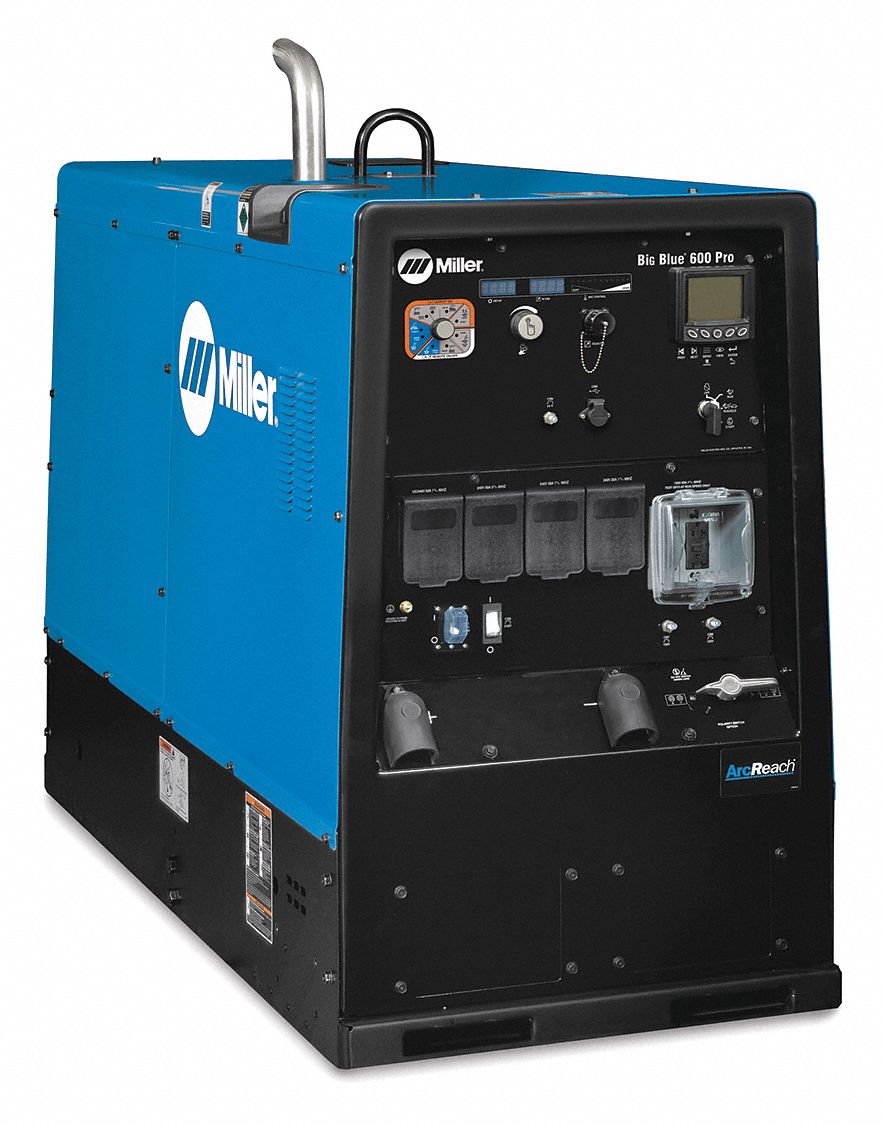 Engine Driven Welder, Big Blue(R) 600 Pro Deluxe, Start Type Electric, Rated Output CC/DC 500A @ 100 Percent, 550A @ 60 Percent, 600A @ 40 Percent, Amperage Range 20 to 600, Continuous Auxiliary Power 20,000W, Peak Auxiliary Power 27,000W, 3 Phase, Engine Brand Kubota, Fuel Type Diesel, 48.9 HP, Height 46 In., Depth 69-1/2 In., Width 28-1/2 In., Includes ArcReach Remote Control Technology