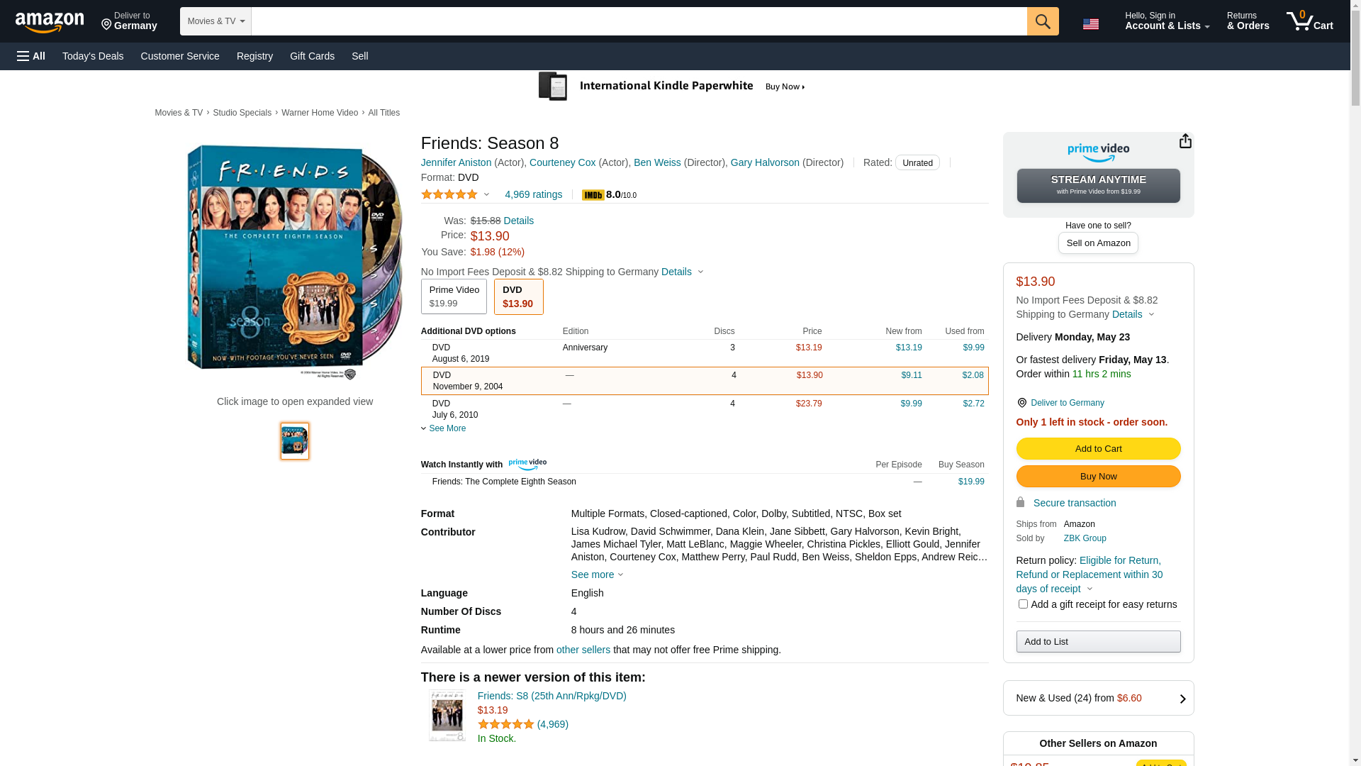 Complete collection of eigth season episodes of the television program about six friends living in New York.<br><b>Item Type: </b>DVD Movie<br><b>Item Rating: </b>NR<br><b>Street Date: </b>09/06/05<br><b>Wide Screen: no<br><b>Director Cut: </b>no<br><b>Special Edition: </b>no<br><b>Language: </b>ENGLISH<br><b>Foreign Film: </b>no<b><b>Subtitles: </b>no<br><b>Dubbed: </b>no<br><b>Full Frame: <b>yes<br><b>Re-Release: </b>no<br><b>Packaging: </b>Sleeve