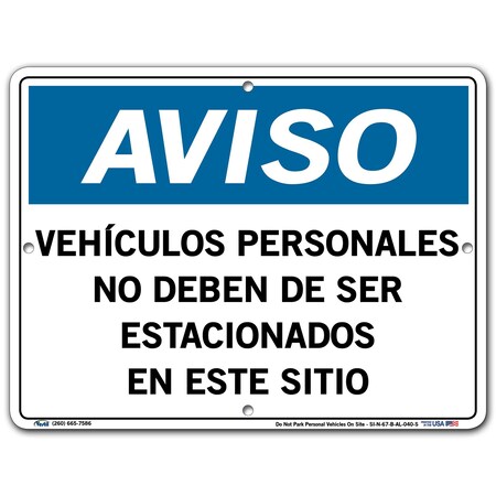 Vestil Notice SignSI-N-67-B-AL-040-S 67 12.5X9.5 Aluminum .040 Do Not Park Personal Vehicles On Site VEHÍCULOS PERSONALES NO DEBEN DE SER ESTACIONADOS EN ESTE SITIO