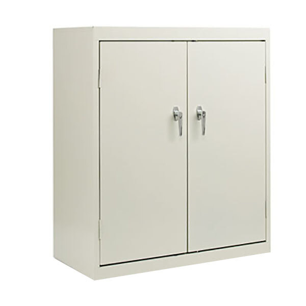 Assembled storage cabinet with three-point locking bar system locks top, bottom and doors. Doors open 180 for easy access to contents. Cabinet made of industrial grade steel with satin chrome double handles. Two adjustable shelves. Color: Light Gray; Overall Width: 36"; Overall Depth: 18"; Overall Height: 42".