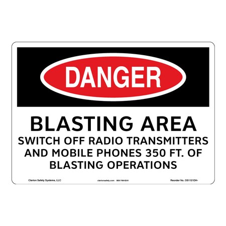 <p><strong>Word Message: </strong><br />BLASTING AREA SWITCH OFF RADIO TRANSMITTERS AND MOBILE PHONES 350 FT. OF BLASTING OPERATIONS</p><p><strong>Description: </strong><br />Clarion Safety Systems brings you Danger Blasting Area Switch Off Radio Transmitters and Mobile Phone 350 FT. of Blasting Operations safety signs (OS1121DH-) which are produced on premium plastic or aluminum material and are designed to meet your OSHA safety sign needs.<p><strong>Material Information:</strong></p> <ul> <li><strong>Material</strong>: (BJ) Indoor/Outdoor Plastic</li> <li><strong>Base Materials</strong>: .060" Rigid White Plastic</li> <li><strong>Overlaminate</strong>: none</li> <li><strong>Mounting Option</strong>: Mounting holes</li> <li><strong>Application</strong>: Indoor/Outdoor</li> <li><strong>MaxTemp</strong> (F): 140</li> <li><strong>MinTemp</strong> (F): 32</li> <li><strong>Chemical Resistance</strong>: Good</li> <li><strong>UV Resistance</strong>: Good</li> <li><strong>Outdoor durability</strong>: Good</li> <li><strong>Storage Stability</strong>: Stable. Optimum storage conditions: 72 F @ 50% relative humidity</li> <li><strong>Expected Life Indoor</strong>: Long term</li> <li><strong>Expected Life Outdoor</strong>: 3-5 year (expected outdoor life may vary due to climatic conditions)</li> <li><strong>RoHS</strong>: Yes</li> <li><strong>CRoHS</strong>: Yes</li> <li><strong>REACH</strong>: Yes</li> </ul>