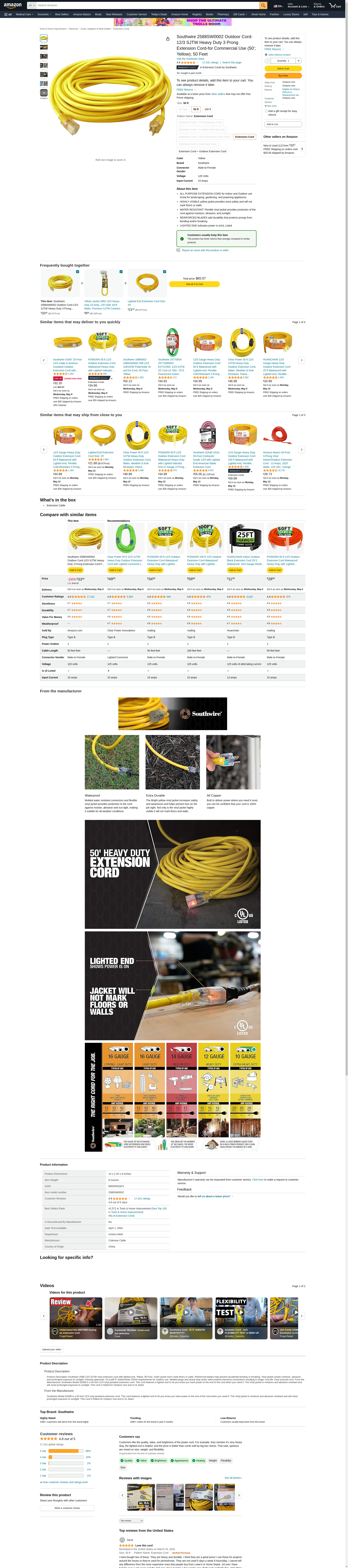 Southwire 2588SW0002 Outdoor Cord-12/3 SJTW Heavy Duty 3 Prong Extension Cord-for Commercial Use (50'; Yellow); 50 Feet - Amazon.com