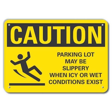 Caution Sign, Horizontal Rectangle, Number of Printed Sides 1, English, Sign Format ANSI/OSHA Format, Sign Legend Parking Lot May Be Slippery When Icy Or Wet Conditions Exist, Sign Legend Background Color Yellow, Sign Legend Style Symbol and Text