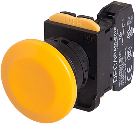 Deca A20B-A4E01Y 22 mm maintained push button has a yellow mushroom head with a 1NC contact arrangement. Not illuminated. Rated IP 65