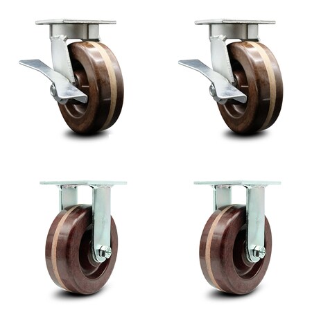 Kingpinless High Temperature Phenolic Swivel Top Plate Caster Set of 4 w/6" x 2" Brown Wheels - Includes 2 Swivel with Brakes & 2 Rigid - 4800 lbs Total Capacity - Service Caster Brand