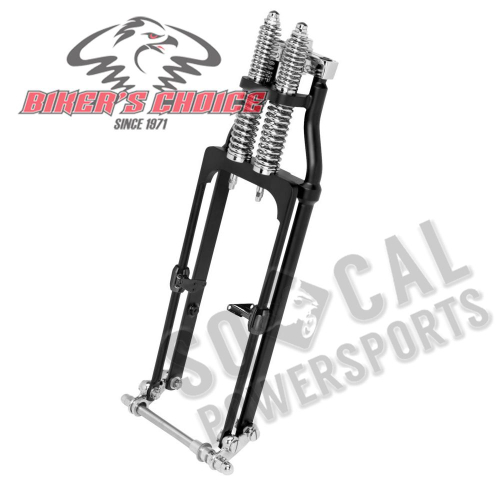 The Biker's Choice Springer Fork Black powder-coat finish 2" low stock; Use with forks that measure 19" to 21" Rake stock Not compatible with OE steering stem bearings Axle included, fender tabs are not included Fits most Cast Big Twins with 49-up necks (except FXR, Dyna and Touring) Fits up to 2003 XL Note: Requires the use of two steering stem bearings (part # m-nb-1000), as well as a set of 4 or 6 inch risers (part # m-hr-1000 and m-nb-1002), all sold separately Sold individually