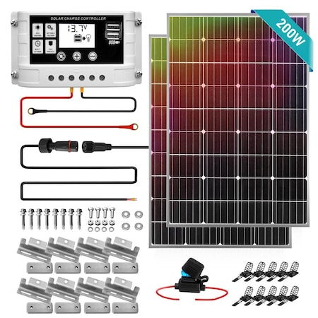 SereneLife 200W Solar Panel Starter Kit Kit-12v Monocrystalline Portable Mono 3 ft 11AWG Cable Set, 30A PWM Controller w/LCD-Van Campers, Car Roof, Boat SLSPSKT200 (2 Pcs)