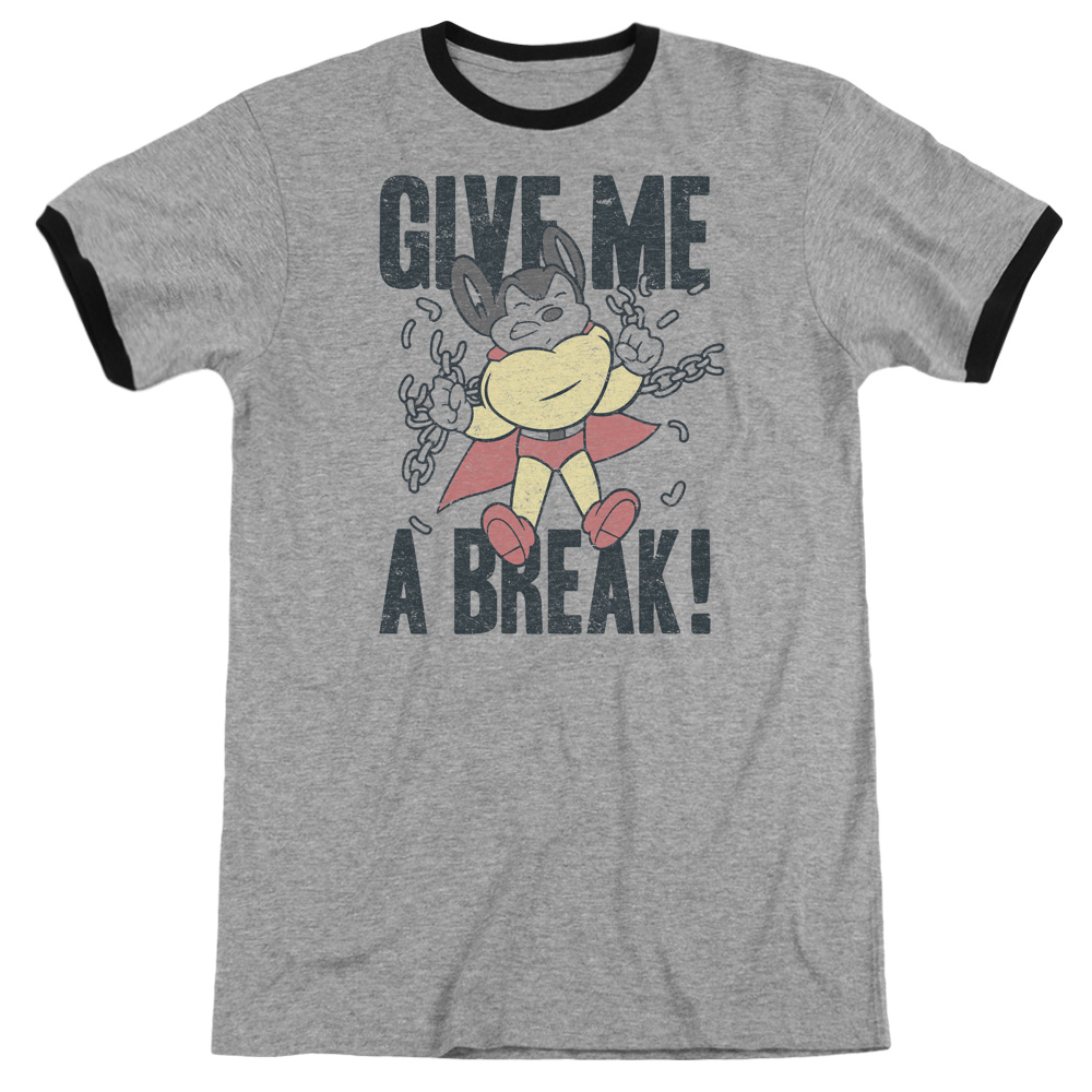 Trevco CBS1587-AR-4 Mighty Mouse & Give Me a Break Adult Ringer Short Sleeve T-Shirt, Heather & Black - Extra Large