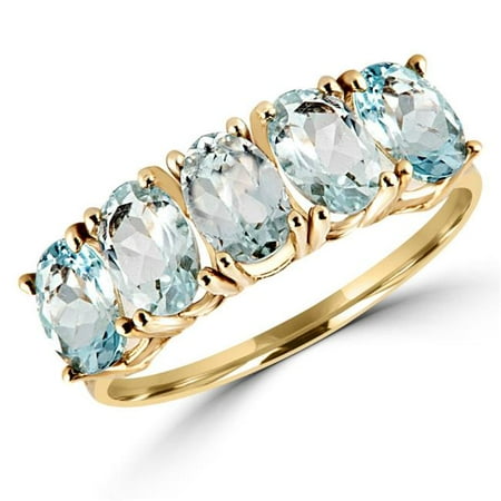 <p>2 CTW Oval 5 Stone Aquamarine Cocktail Anniversary Ring in 10K Yellow Gold </p> <p>Distinctive details. Wear this cocktail ring on your finger for a special night. Walk down the promenade and look great. Display this ring with a string of freshwater pearls or earrings. </p> <b>Features</b> <ul> <li>Elegant, simple design</li> <li>Demure and well-crafted to last generations</li> <li>A great value priced well below retail</li> </ul> <b>Specifications</b> <ul> <li><b>Size:</b> 5.75</li> <li><b>Number of Stone:</b> 5</li> <li><b>Carat Weight:</b> 2</li> <li><b>Stone Type:</b> Aquamarine</li> <li><b>Stone Shape:</b> Oval</li> <li><b>Cut:</b> Very Good</li> <li><b>Color:</b> Blue</li> <li><b>Clarity:</b> AAA</li> <li><b>Metal:</b> 10K Gold</li> <li><b>Metal Weight:</b> 1.7 Grams</li> <li><b>Color:</b> Yellow</li> <li><b>Finish:</b> Polished</li> <li><b>Setting Type:</b> Prong</li> <li><b>Ring Size:</b> 4 to 9</li> </ul>- SKU: MJTD36826