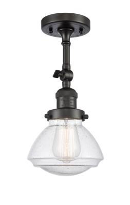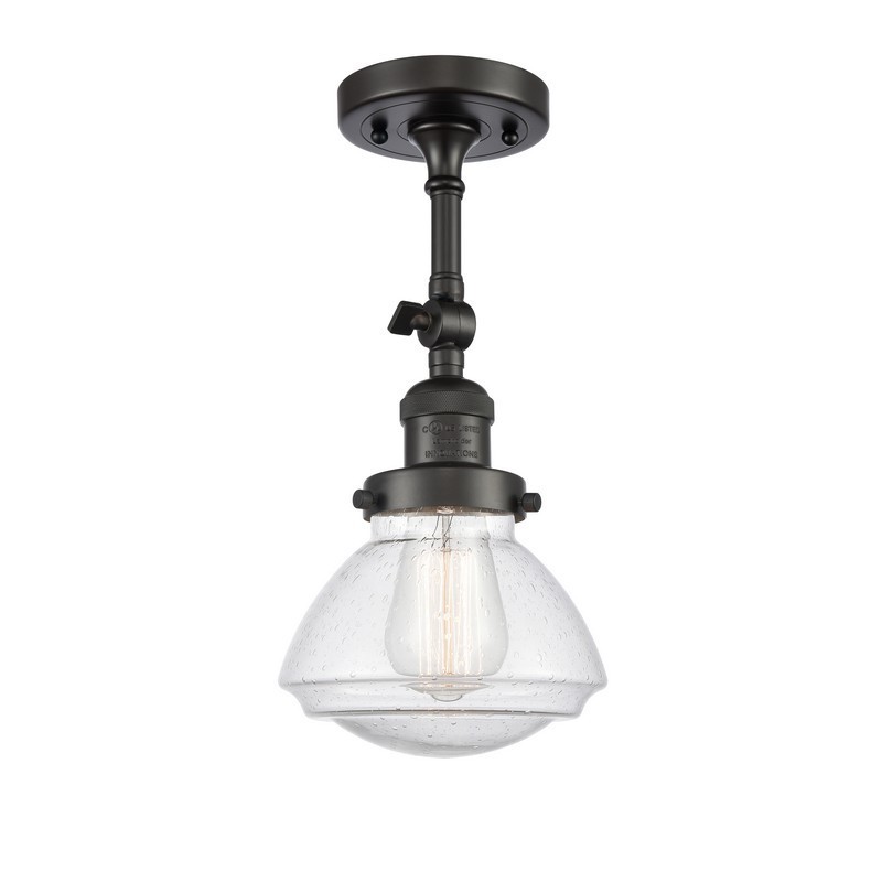 INNOVATIONS LIGHTING 201F-OB-G324 Olean 1 Light Semi-Flush Mount part of the Franklin Restoration Collection. The Olean 1 Light Semi-Flush Mount is part of the Franklin Restoration Collection. Solid Brass 180 Degree Adjustable Swivel with internal teeth that lock in at 5 degree intervals With Engraved Cast Cup. Collection: Franklin Restoration. Material: Steel, Cast Brass, Glass. Metal Finish(Body): Oil Rubbed Bronze. Metal Finish(Canopy/Backplate): Oil Rubbed Bronze. Dimension(in): 6.75(W) x 11.25(H) x 6.75(Dia). Bulb: (1)100 Medium Base Vintage Bulb recommended(Not Included). Voltage: 120. Glass: Seedy Olean/Seeded. Shade Shape: Bell. Shade Material: Glass. Shade Size(in): 6.75 X 5. Shade Fitter Measurement: 3.25 inch Fitter. Canopy Dimension(in): 4.5. Solid Brass 180 Degree Adjustable Swivel with internal teeth that lock in at 5 degree intervals With Engraved Cast Cup. Slope Ceiling Compatible. Fixture can be hung with bulbs facing up or down as a Wall Mount or Facing Down as a Ceiling Mount. UL/CUL Damp Rated. Warranty: 2 Year Finish, Lifetime Electrical.