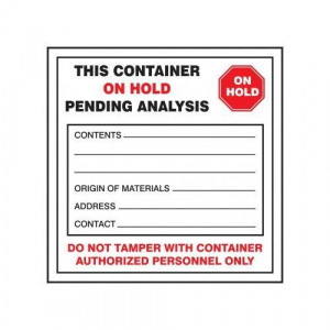 | Feature | <b>Price For:</b> Each <b>Item</b>: Waste Label <b>Header</b>: This Container On Hold Pending Analysis <b>Background Color</b>: White <b>Standards</b>: D.O.T. (49 CFR Part 172) and EPA (40 CFR Part 262.31 - 32) <b>Language</b>: English <b>Shape</b>: Square <b>Legend</b>: Contents________Origin of Materials_______Address_______Contact_______ Do Not Tamper With Container Authorized Personnel Only <b>Legend/Background Color</b>: Black, Red/White |