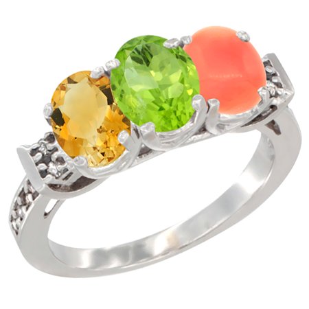 14K White Gold Natural Citrine, Peridot & Coral Ring 3-Stone 7x5 mm Oval Diamond Accent, sizes 5 - 10