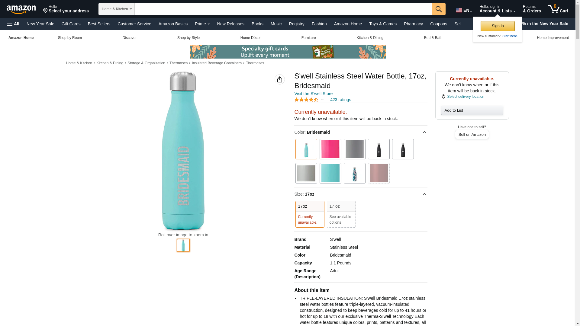 Established in 2010, S'well is the only reusable bottle that looks great and does good. S'well keeps your drinks cold for 24 hours or hot for 12, while giving back to those in need. S'well bottles are beautifully crafted and designed to last. Composed of 18/8 premium grade stainless steel, S'well bottles are insulated to eliminate condensation so they never sweat on your hands or in your bag. Designed to suit all of your hydration needs, S'well bottles come in three sizes: 9oz, 17oz, and 25oz. Whether you're on the road or in the office, there's a S'well bottle just for you.