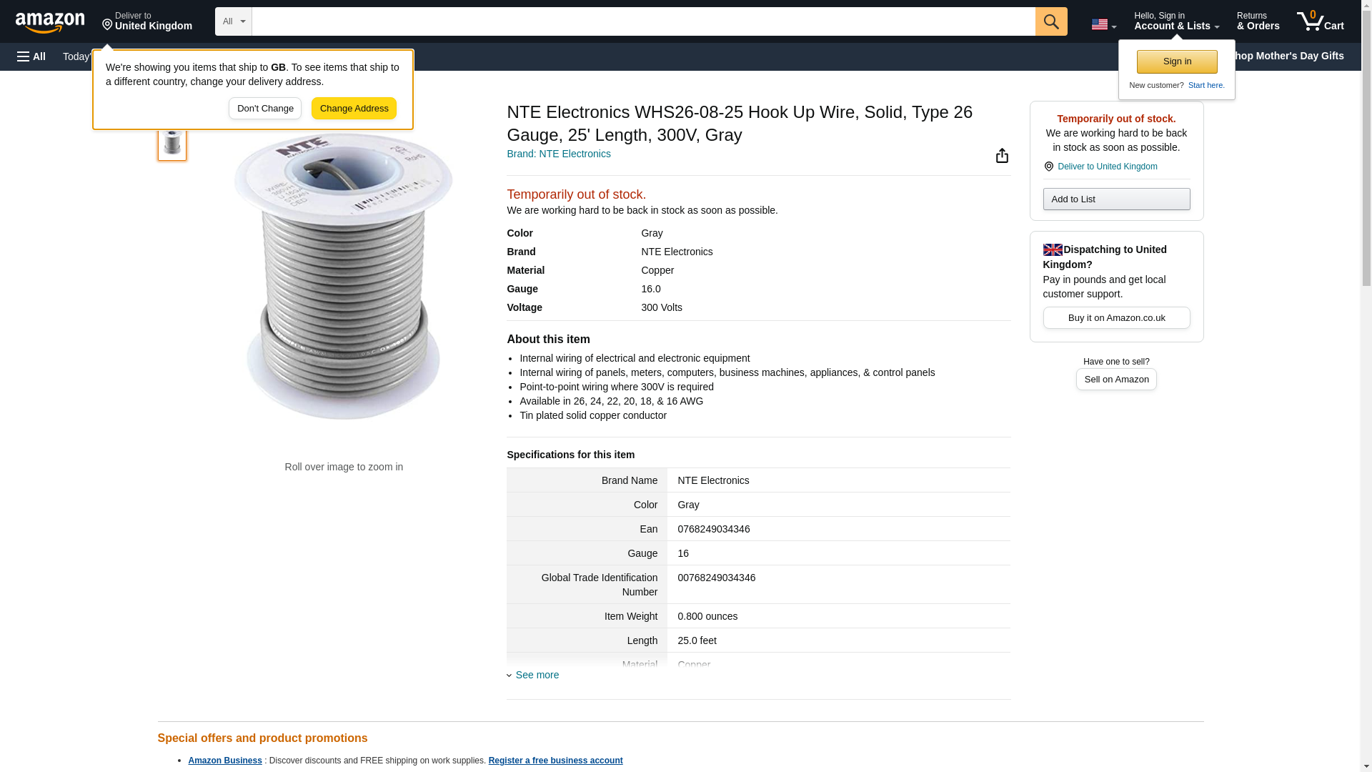 NTE ELECTRONICS WHS26-08-25 HOOK UP WIRE 300V SOLID TYPE 26GAUGE GRAY 25 FEET (100 pieces)