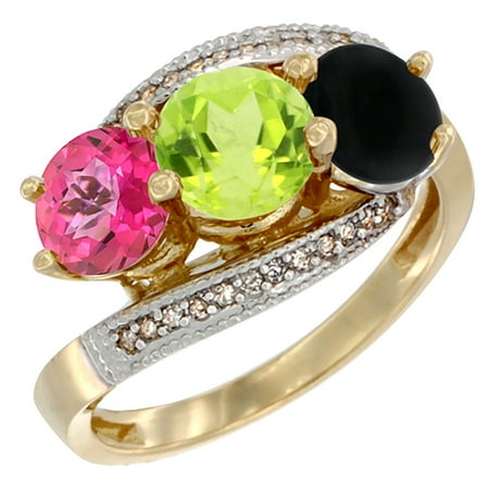 10K Yellow Gold Natural Pink Topaz, Peridot & Black Onyx 3 stone Ring Round 6mm Diamond Accent, sizes 5 - 10