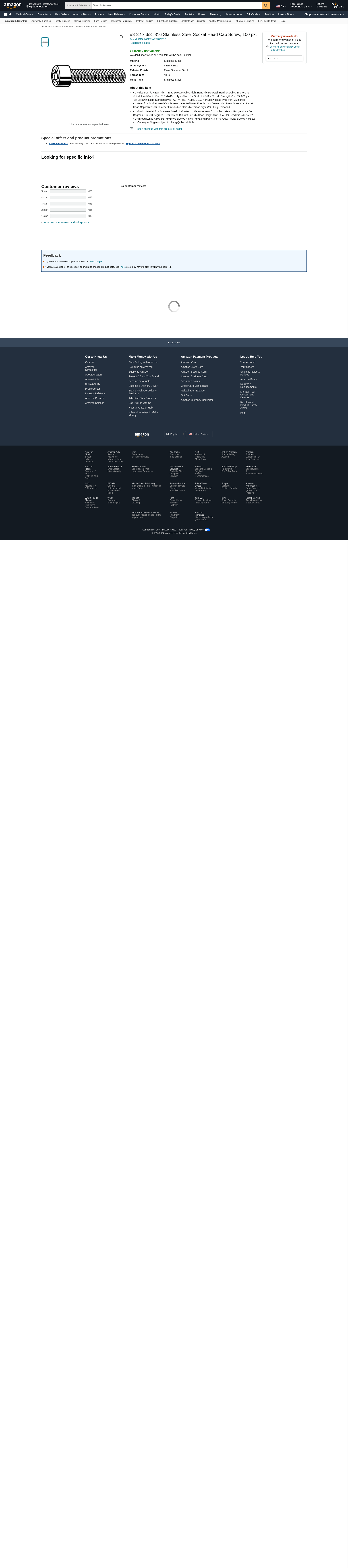 'Socket Head Cap Screw, System of Measurement Inch, Cylindrical, Basic Material Stainless Steel, Material Grade 316, #8-32, Length 3/8 In., Fastener Finish Plain, Fastener Thread Type UNC, Drive Type Hex Socket, Drive Size 9/64 In., Thread Style Fully Threaded, Thread Direction Right Hand, Thread Length 3/8 In., Head Height 5/64 In., Thread Dia. #8, Package Quantity 100'