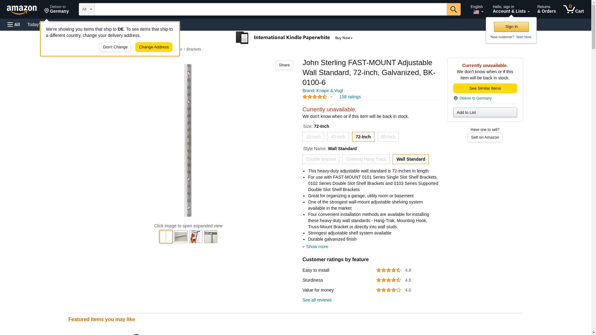John Sterling FAST-MOUNT Adjustable Wall Standard, 72-inch, Galvanized, BK-0100-6