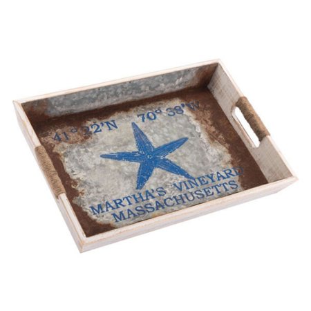 <ul> <li>This distressed painted wood tray with a starfish accent will add a coastal vibe to your space</li> <li>Functional and decorative with steel accented cut-out handles for serving</li> <li>Generous in scale</li> <li>Its a nice size to place on a large ottoman or kitchen island</li> <li>Dimensions: w 17.3 x h 2.4 x l 12 inches, weight: 1 lbs.</li> </ul>