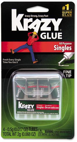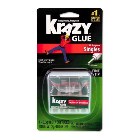 Click images to enlarge: List Price $ 4.61Manufacturers Item number: KG58248SNADHESIVE,KRAZY GLUE,CLRSingle-use applicators have just enough in each tube for one fast fix. Simply twist the self-piercing nozzle to open, then use it and throw away. Convenient storage case keeps kitchen drawers and workshops organized. Dries clear. Adhesive Type: Liquid; Color Dried: Clear; Capacity (Volume): 0.07 oz; Suggested Use: Glass; Metal; Plastics; Rubber; Wood.Package Includes Includes four tubes of glue.Manufactured by Krazy Glue Product SpecificsSold as Pack 4 Each in 12 PackTo order a carton, order 4 PackItem may be returned for 30 days from date of purchaseUPS ShippableAssembly Required: NoMade from Recycled Material: NoItem Weight: .06 lbs.Carton Weight: 5 lbs.Material Safety Data Sheet Available here Krazy Glue; Super Glue; Bonding; Affixers; Hobbies; Crafts; Education; Teachers; Classroom; Art; BORKG58248SN