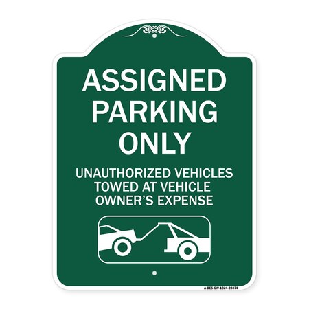 SignMission Designer Series Sign - Parking Restriction Sign Assigned Parking Only, Unauthorized Vehicles Towed at Owner Expense with Graphic | Green & White 18" X 24" Heavy Aluminum Architectural Sign