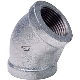 'Elbow, 45 Degrees , Pipe Fitting Material Galvanized Malleable Iron, Fitting Schedule/Class Class 150, Pipe Size (Fittings) 1-1/4 In., Fitting Connection Type FNPT, Standards UL Listed, FM Approved, Meets ASME B16.3, ASTM A197, Max. Pressure 300 psi @ 150 Degrees F WOG, Saturated Steam Pressure 150 psi @ 350 Degrees F, Temp. Range -20 Degrees to 350 Degrees F'