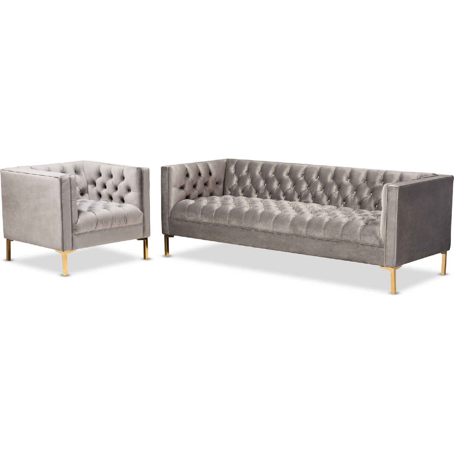Baxton TSF-7723-Grey/Gold-2PC Set Zanetta Sofa & Accent Chair Set in Tufted Gray Velvet & Gold