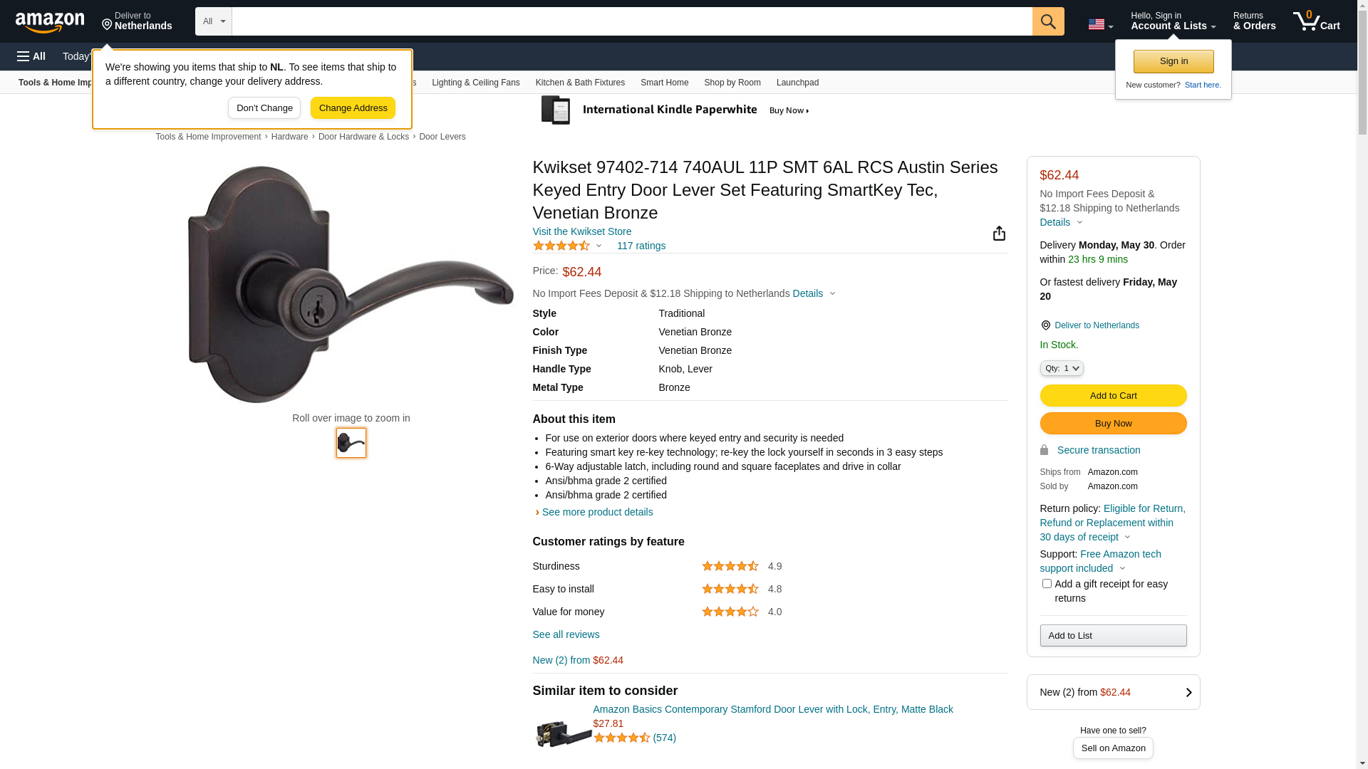 Kwikset 97402-714 740AUL 11P SMT 6AL RCS Austin Series Keyed Entry Door Lever Set Featuring SmartKey Tec, Venetian Bronze