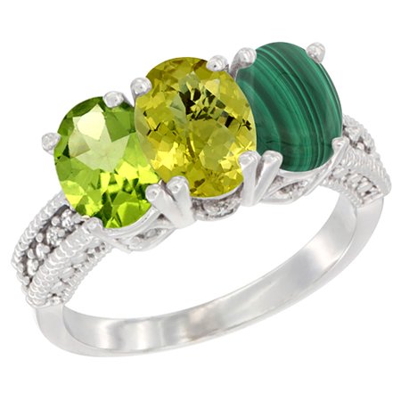 14K White Gold Natural Peridot, Lemon Quartz & Malachite Ring 3-Stone Oval 7x5 mm Diamond Accent, sizes 5 - 10