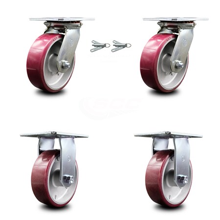 Heavy Duty Large Top Plate Polyurethane on Aluminum Swivel Caster Set of 4 w/6" x 2" Maroon Wheels - Includes 2 Swivel with Bolt on Swivel Locks & 2 Rigid-4800lbs Total Capacity - Service Caster Brand