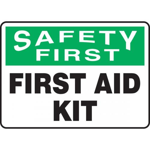 OSHA Safety First Safety Signs: First Aid Kit, 10" x 14". Aluminum signs can withstand wash downs, harsh elements, abusive conditions, and features good chemical, abrasion, and impact resistance. Excellent for indoor and outdoor usage, aluminum is ideal for a wide variety of industrial-strength applications. All Aluminum signs feature Accuform "Duck Armor" liquid-based UV-protective coating which prevents fading and resists chemicals, abuse, and graffiti. <br>Service temperature range is -40 to 250F.
