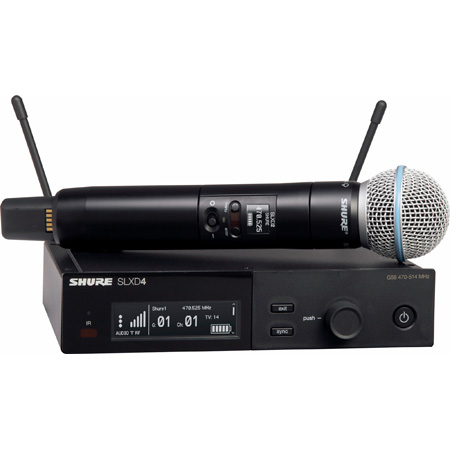 Your performance should never be in question. Whether presenting, educating, praising or entertaining, your relationship with your audience is singular. With the Shure <b>SLXD24/B58-J52</b> BETA 58 Vocal Handheld Wireless Mic System you can stand confidently on a strong foundation and build the wireless installation to match ongoing demands, from day-long conference to nighttime performances. Shure SLX D Wireless Systems are the digital wireless solutions for small and medium-sized facilities that provide affordable, worry-free UHF-band RF performance, transparent audio quality and streamlined maintenance because of spectrum efficiency, digital audio and ease of setup and rechargeability.</p><p>The Shure SLXD includes predictive diversity for extended antenna coverage and improved RF signal-to-noise ratio. It operates within an extended spectrum of UHF (470-938 MHz, region dependent). The tuning bandwidth goes up to 44MHz (selectable RF band) with up to 32 preset compatible channels and is capable of operating up to 10 compatible channels in a 6 MHz TV band or 12 compatible channels in an 8 MHz TV band. The entire system shall deliver high-quality transparent audio, with a flat frequency response over a wide range from 20Hz to 20kHz, providing accurate audio reproduction and a low-latency of 3.2ms. The dynamic range shall be up to 120 dB. </p><p>Receivers provide single and dual channel options and have a menu option to guide the user step-by-step in setting up the RF frequency to either initiate new systems or add a new system to existing systems. The receiver shall sync the frequency to the transmitter via infrared lens. Once the system is setup, the receiver can store the configuration and restore it back if the configuration is changed accidentally. Receivers have both XLR and 1/4? audio outputs. The receiver can select the microphone level and line level output via menu operation.</p><p>Shure SLXD transmitters have a high-contrast OLED display indicating channel name, battery status, and frequency. Both the receiver and bodypack/handheld transmitter shall be able to be locked with the options of either locking the menu only, or locking both the menu and power. The transmitter is also be able to be temporarily unlocked and automatically locked back after a certain idle time. Transmitter bodypacks use a TA4M connector as the mic connection. The bodypack and handheld are powered by two AA batteries or the SH-SB903 lithium ion rechargeable battery. The bodypack and handheld shall be able to be docked and charged on a SBC203 dual docking charger.</p>