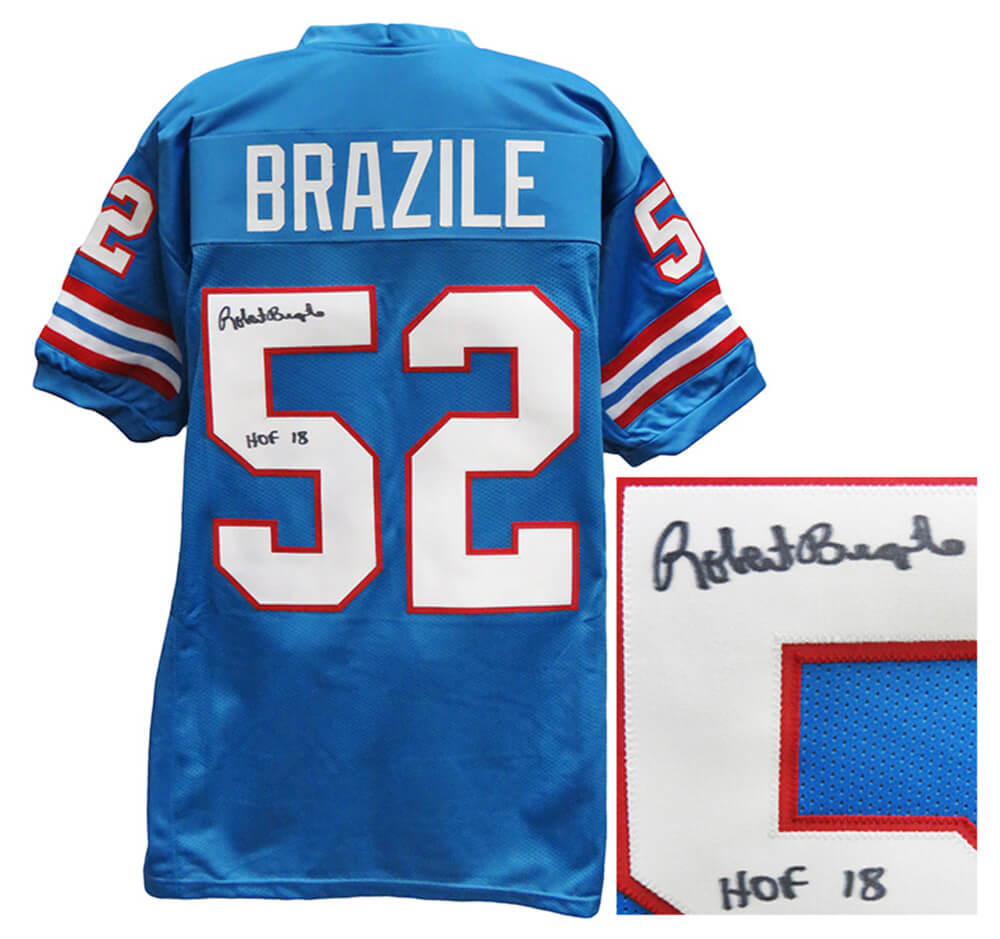 Schwartz Sports Memorabilia BRAJRY320 Robert Brazile Signed Blue Throwback Custom Football Jersey with HOF 18