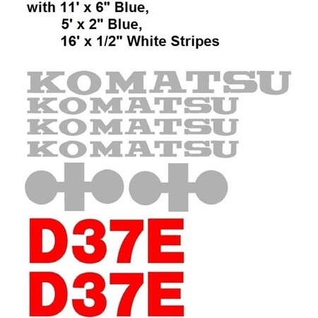 One New Aftermarket Replacement Fits Komatsu Dozer D37E Decal Set, With 11' X 6" Blue, 5' X 2" Blue, and 16' X 1/2" White Stripes. For This Decal Set Without The Stripes, Search For Komatsu D37E Decal Set Without Stripe. Made With 7-9 Year Outdoor Vinyl With Factory Spec and Sizing. High Quality Decals Made To Withstand The Elements Of Weather For Up To 9 Years. Decal Colors Will Be Just Like The Oem Colors In The Picture. Replaces Part Number: Komd37Ewsdecalset<br> All OEM part numbers and logos are to be used for identification purposes only