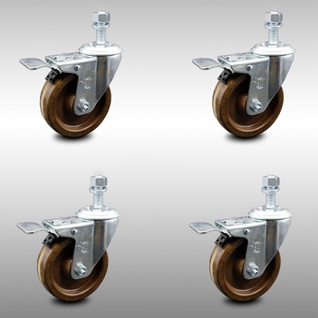 Stainless Steel High Temperature Phenolic Swivel Threaded Stem Caster Set of 4 w/4" x 1.25" Brown Wheels and 12mm Stems - Includes 4 with Total Lock Brakes-1200 lbs Total Capacity-Service Caster Brand