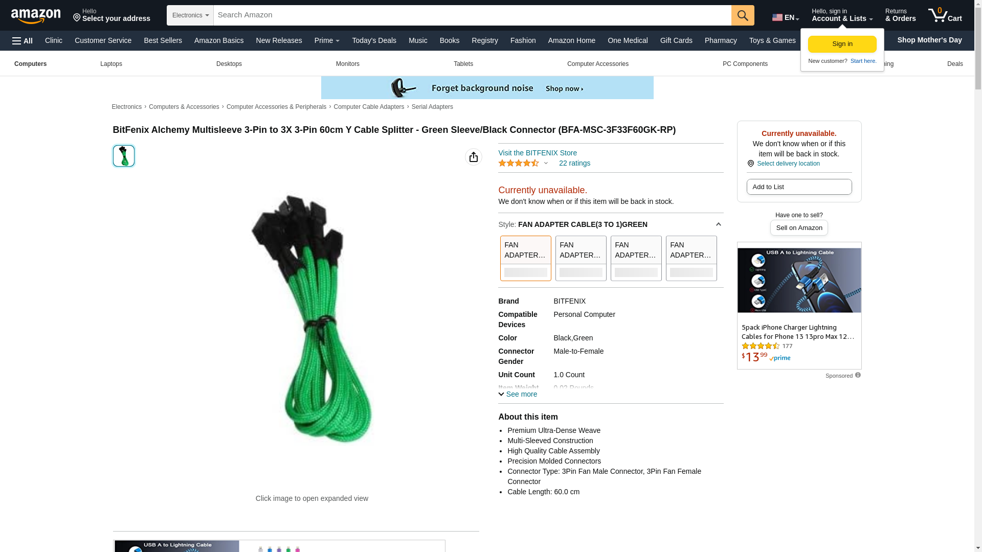 BitFenix Alchemy Multisleeve 3-Pin to 3X 3-Pin 60cm Y Cable Splitter - Green Sleeve/Black Connector (BFA-MSC-3F33F60GK-RP)